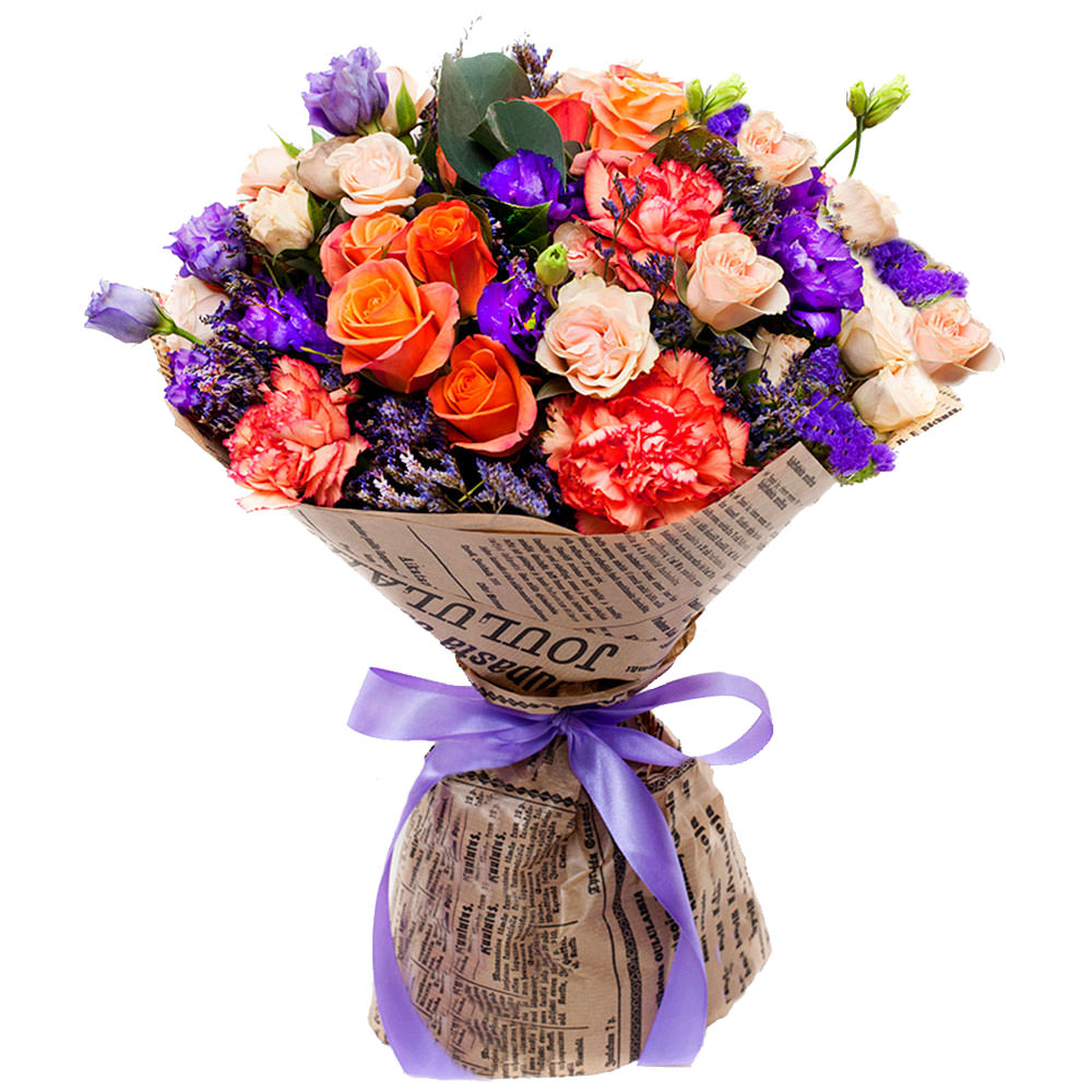 Роза одноголовая оранжевая, гвоздика бело-красная, эустома фиолетовая, статица, роза кустовая кремовая. Упаковка (лента, пленка, крафт, сетка, пленка матовая)