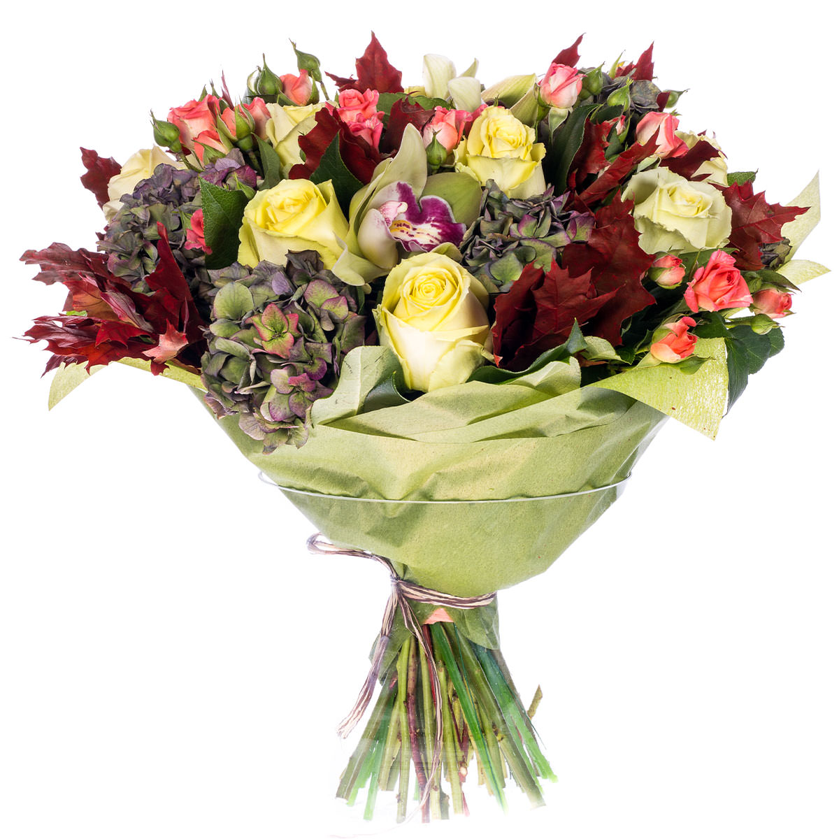 Роза одноголовая белая, роза кустовая розовая, орхидея, гортензия фиолетовая, кленовые листья. Упаковка (лента, пленка, крафт, сетка, пленка матовая)