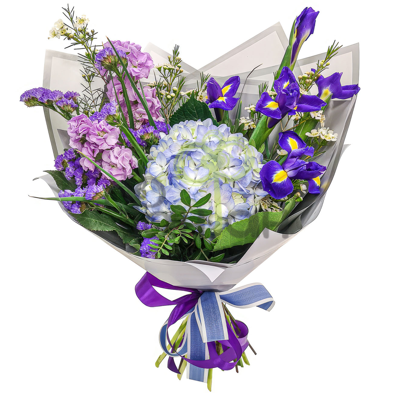 Ваксфлауэр, ирис, гортензия, статица, маттиола, зелень. Упаковка (лента, пленка, крафт, сетка, пленка матовая)