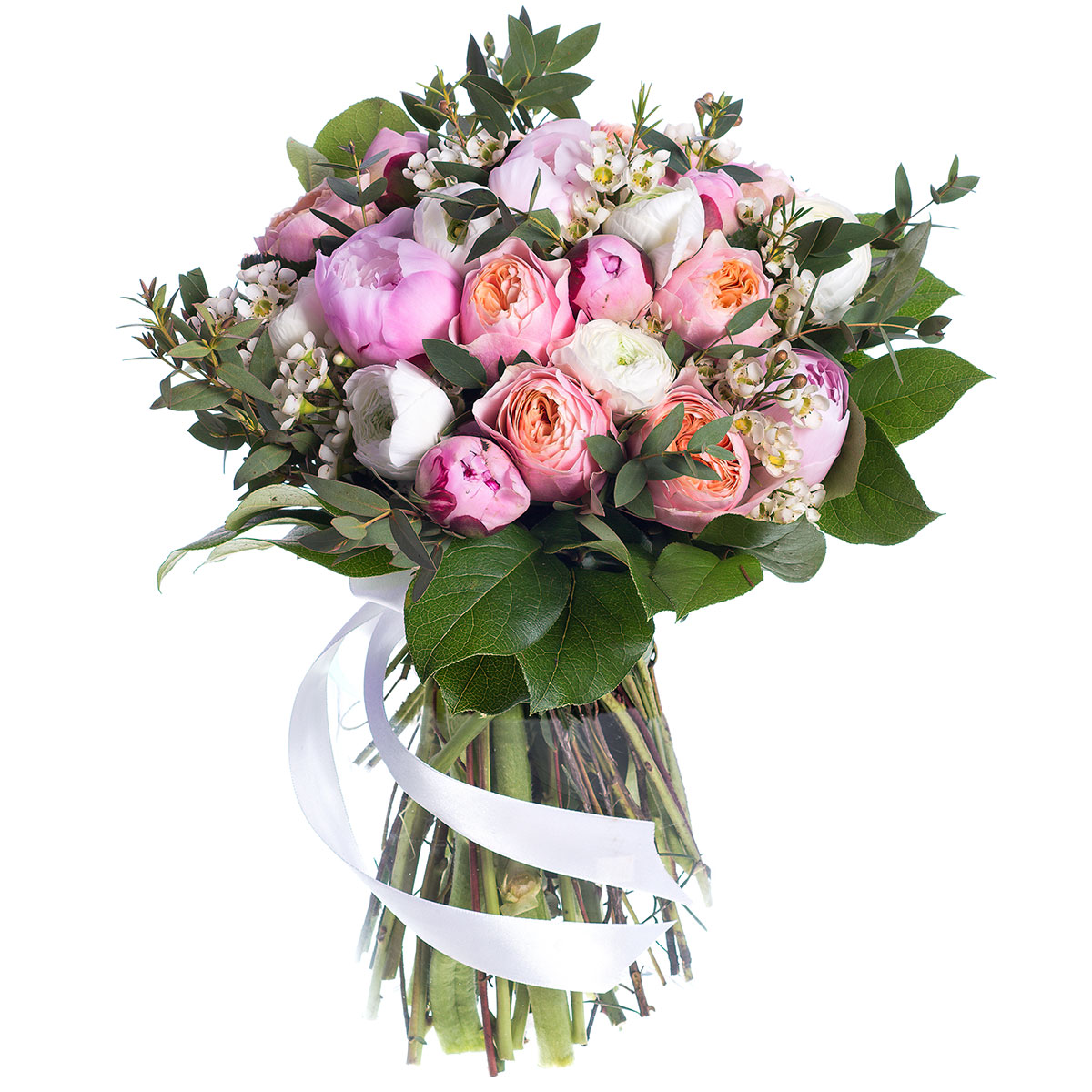 Пион розовый, роза пионовидная розовая и белая, ваксфлауер, зелень. Упаковка (лента, пленка, крафт, сетка, пленка матовая)