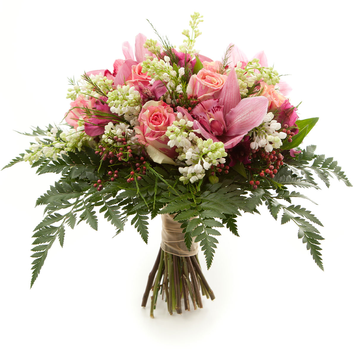Роза одноголовая двухцветная, сирень белая, орхидея розовая, озотамнус, зелень. Упаковка (лента, пленка, крафт, сетка, пленка матовая)
