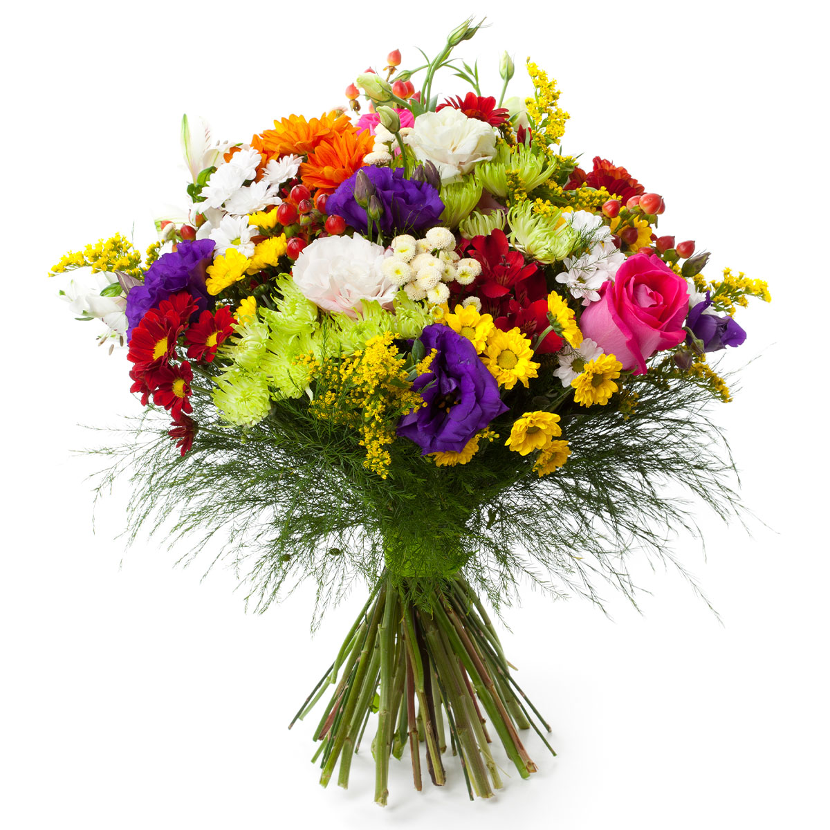 Роза одноголловая розовая, хризантема кустовая желтая, оранжевая и красная, эустома фиолетовая, хризантема игольчатая, солидаго, гиперикум, аспарагус. Упаковка (лента, пленка, крафт, сетка, пленка матовая)