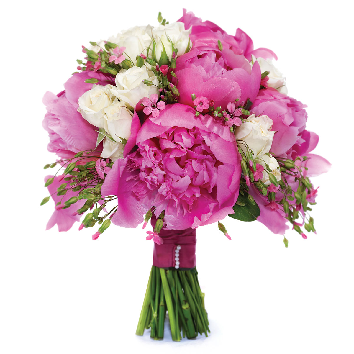 Пион розовый, роза кустовая белая, диасция. Упаковка (лента, пленка, крафт, сетка, пленка матовая)
