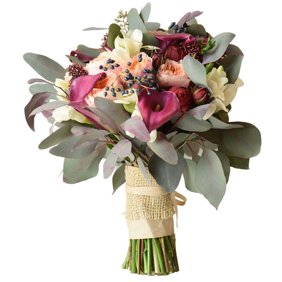 Калла розовая, роза пионовидная кремовая, роза кустовая красная, фрезия белая, озотамнус, эвкалипт. Упаковка (лента, пленка, крафт, сетка, пленка матовая)