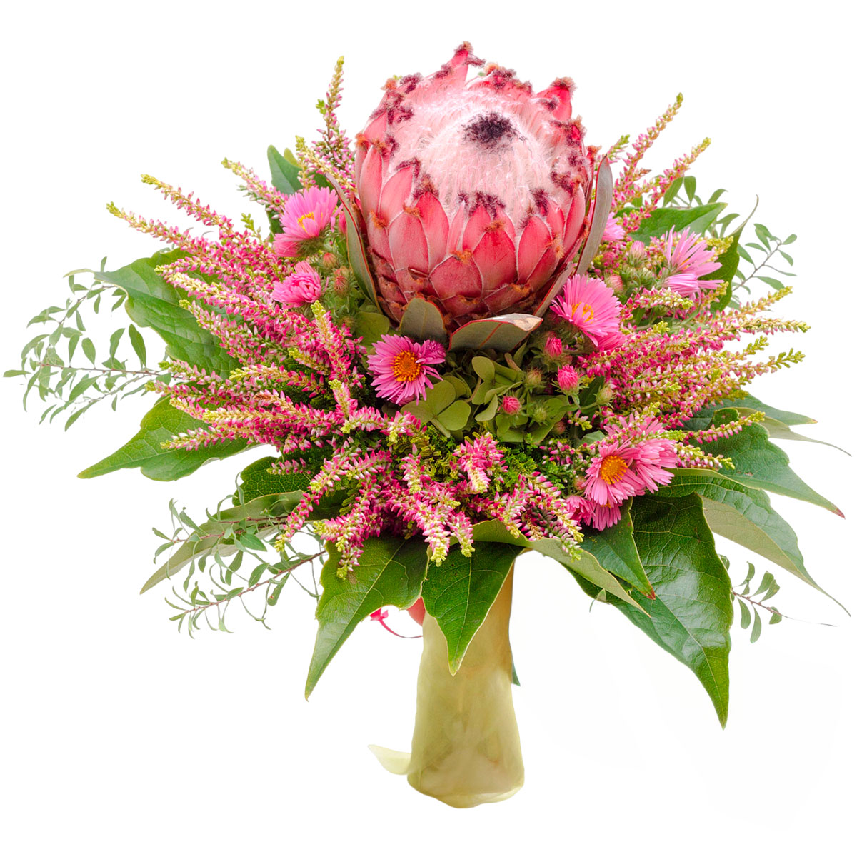 Протея, астра розовая, вереск, зелень. Упаковка (лента, пленка, крафт, сетка, пленка матовая)