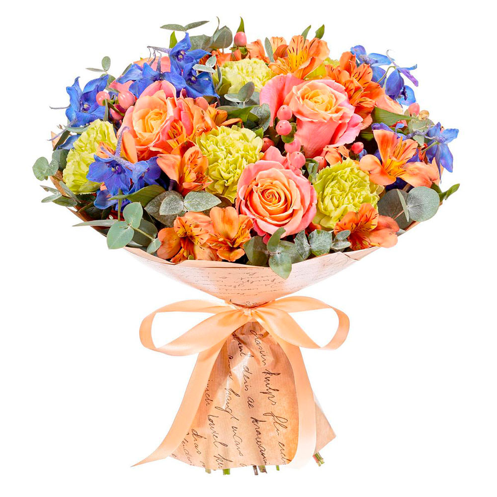 | Состав | Альстромерии, Гвоздики, Колокольчики, Кустовые розы, Розы, Эвкалипт |