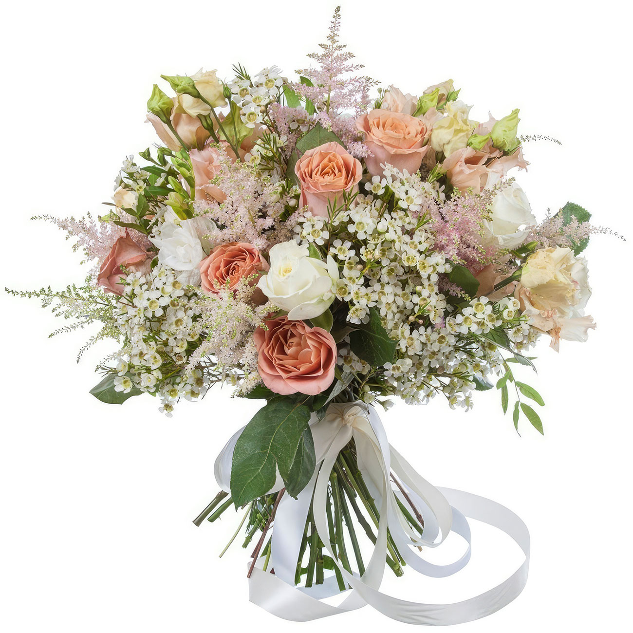 Ваксфлауэр, роза одноголовая пудровая, эустома кремовая, астильба. Упаковка (лента, пленка, крафт, сетка, пленка матовая)