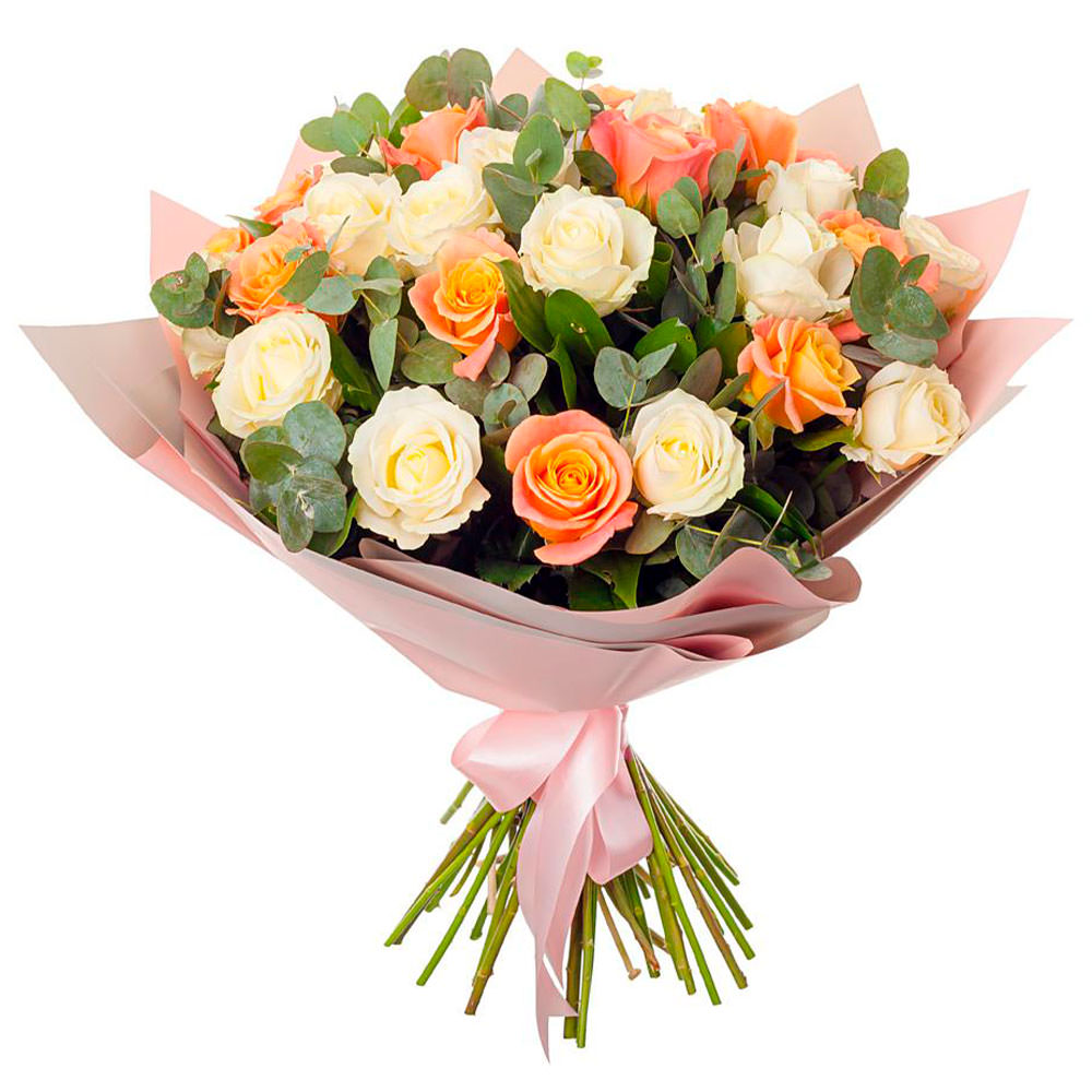Роза одноголовая микс (кремовая, оранжевая), эвкалипт. Упаковка (лента, пленка, крафт, сетка, пленка матовая)