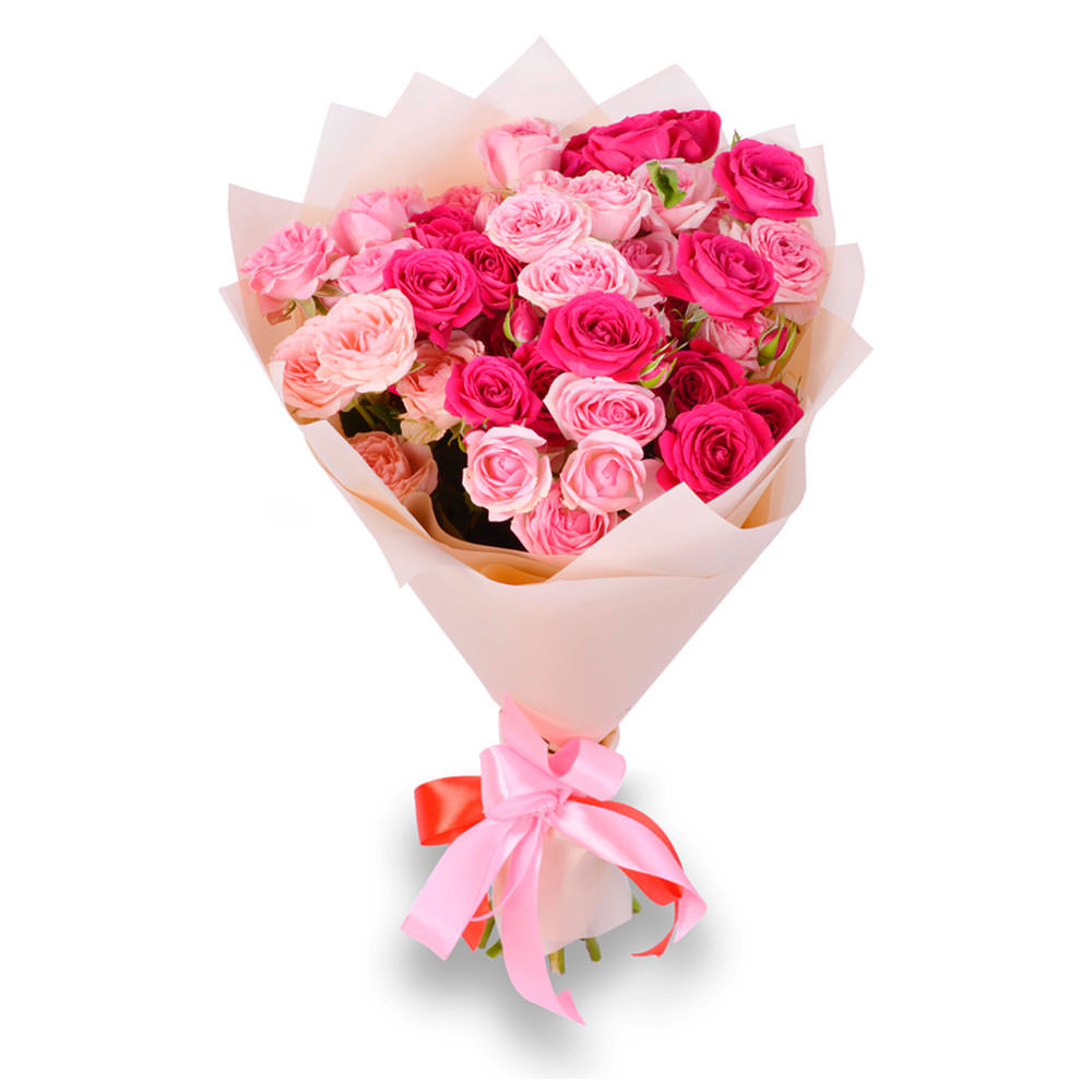 Роза кустовая микс (нежно-розовая, розовая). Упаковка (лента, пленка, крафт, сетка, пленка матовая)