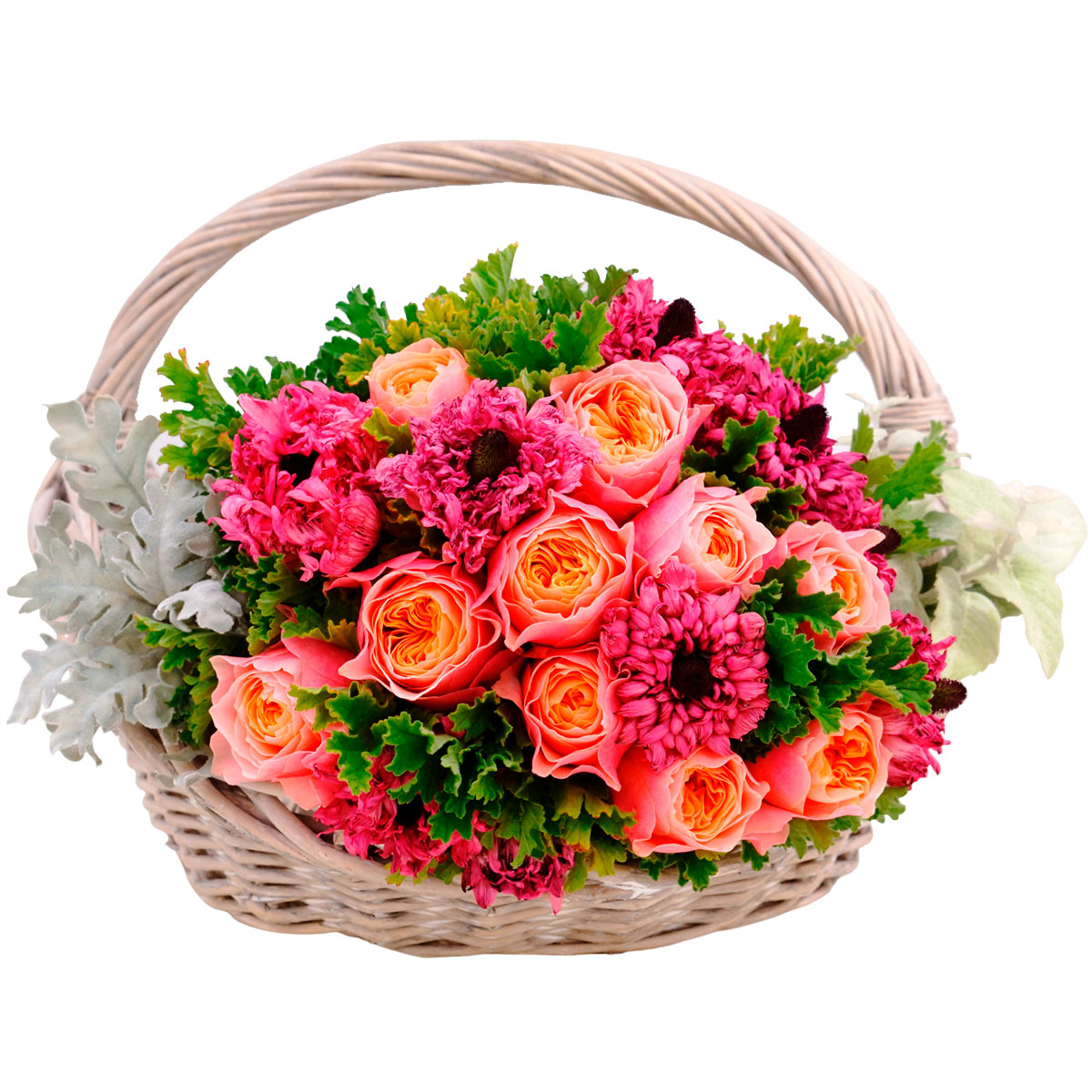Роза одноголовая пионовидная коралловая, хризантема розовая, сенецио цинерария. Упаковка (Корзина, оазис, ящик).