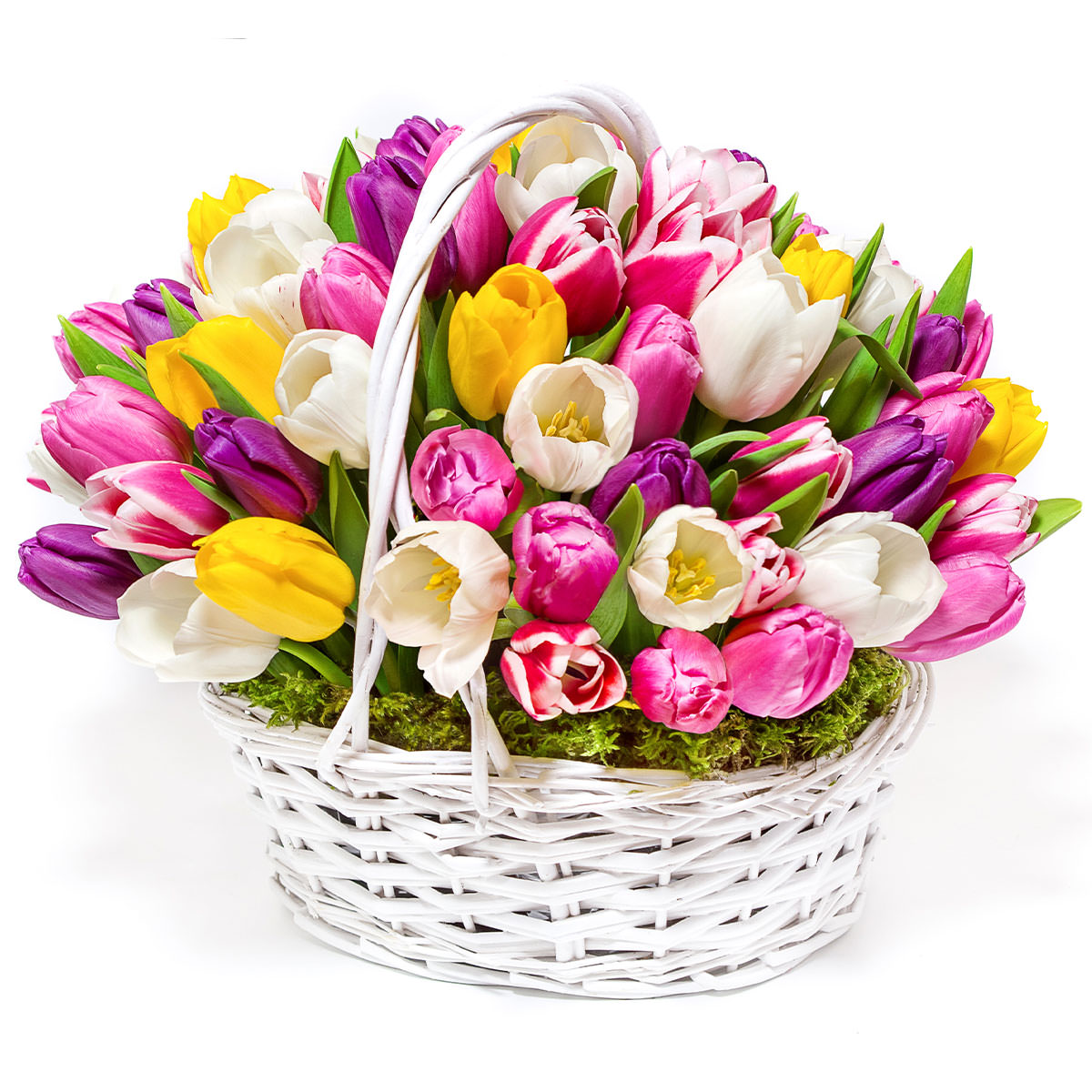 Тюльпан разных цветов. Упаковка (Корзина, оазис, ящик).