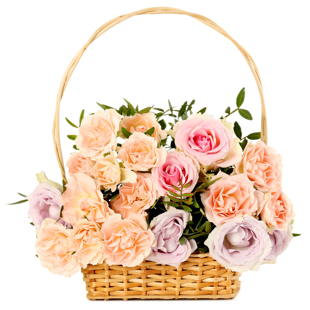 Роза одноголовая розовая, сиреневая, и персиковая, фисташка. Упаковка (Корзина, оазис, ящик).