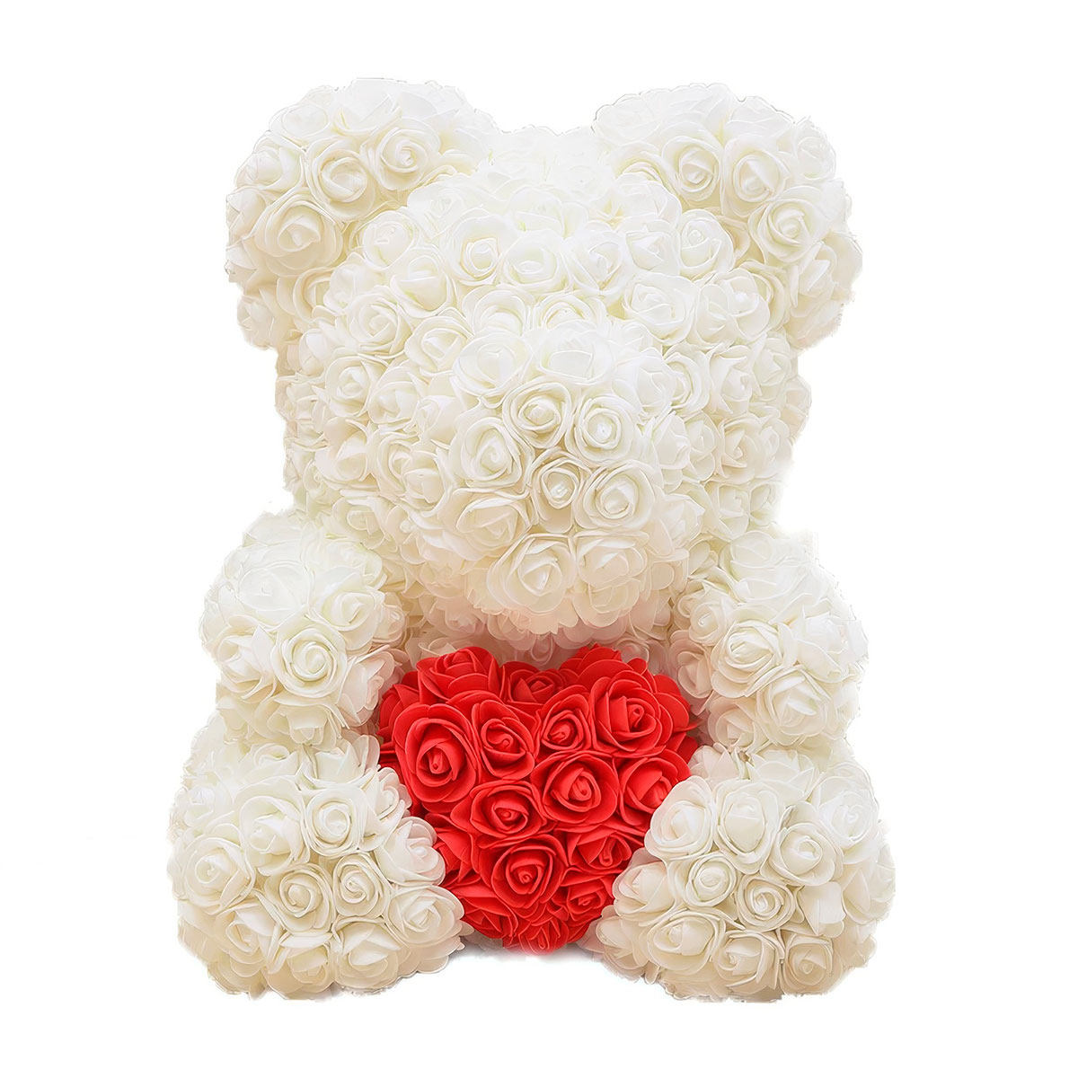 Мишка из роз бежевый с красным сердцем — созданный из более чем 600 великолепных 3D розочек.
