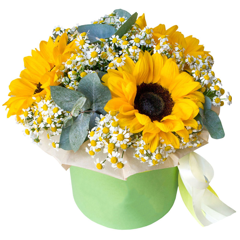 Подсолнух, танацетум, эвкалипт. Упаковка (шляпная коробка, квадратный бокс, коробка сердце, оазис)