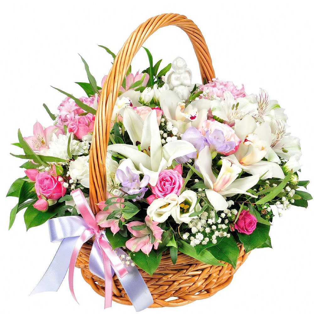 Лилия белая, эустома белая, орхидея белая, альстромерия белая, роза кустовая розовая, гипсофила. Упаковка (Корзина, оазис).